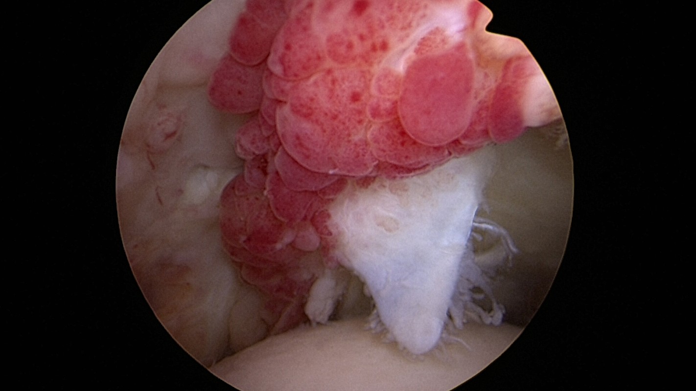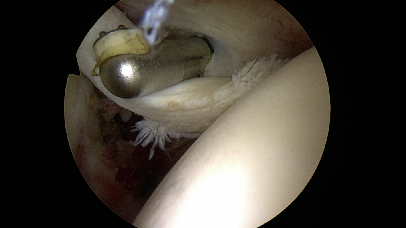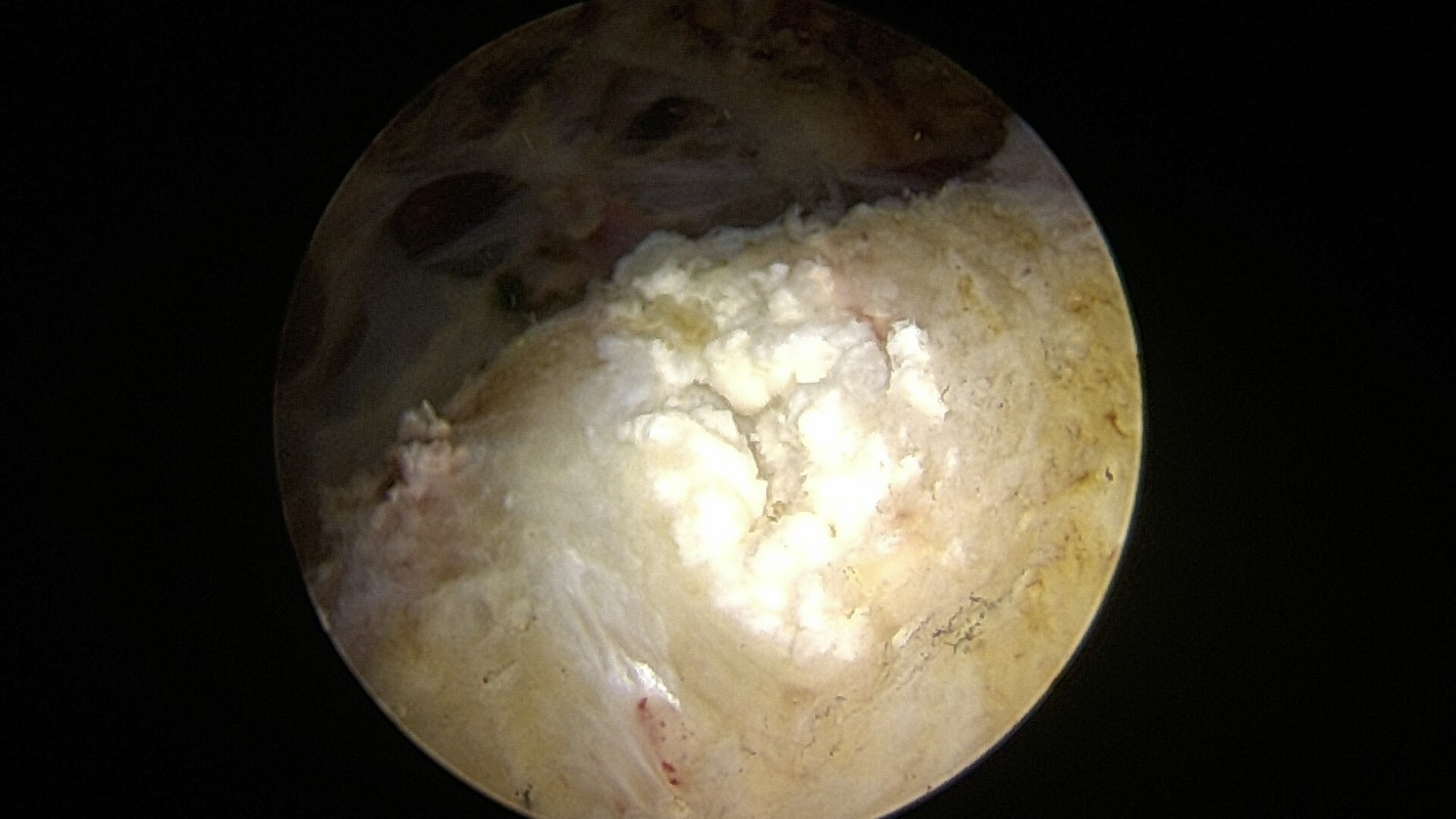 Il reste une épaisseur variable de tendon qui n’est pas totalement perforé mais qui prend parfois un aspect poreux. Il sera plus ou moins amincis et fragilisé, ce qui le rend douloureux (Fig. 3 cercle bleu).